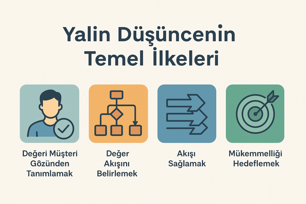 Yalın düşünce, ilk olarak Toyota Üretim Sistemi (TPS) çerçevesinde geliştirilmiş ve daha sonra birçok sektöre uyarlanmıştır. Temel ilkeleri şunlardır:
