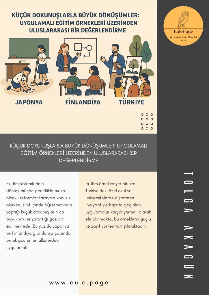 Eğitim sistemlerinin dönüşümünde genellikle makro ölçekli reformlar tartışma konusu olurken, sınıf içinde öğretmenlerin yaptığı küçük dokunuşların da büyük etkiler yarattığı göz ardı edilmektedir. Bu yazıda Japonya ve Finlandiya gibi dünya çapında örnek gösterilen ülkelerdeki uygulamalı eğitim örnekleriyle birlikte, Türkiye’deki özel okul ve üniversitelerde öğretmen inisiyatifiyle hayata geçirilen uygulamalar karşılaştırmalı olarak ele alınmakta, bu örneklerin güçlü ve zayıf yönleri tartışılmaktadır.