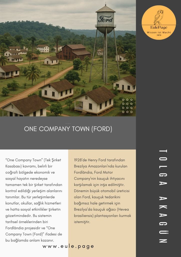 Bir Tek Şirket Kasabasının Yükselişi ve Çöküşü Modern sanayileşme süreci, yalnızca üretim biçimlerini değil, aynı zamanda insanların yaşama, çalışma ve sosyalleşme biçimlerini de radikal şekilde dönüştürmüştür. Bu dönüşümün en dikkat çekici örneklerinden biri, “One Company Town” (Tek Şirket Kasabası) olarak adlandırılan yerleşim biçimidir. Bu yerleşimlerde neredeyse tüm ekonomik ve sosyal yapı tek bir şirketin kontrolünde şekillenmektedir. Kasaba halkının barınmadan sağlığa, eğitimden eğlenceye kadar tüm temel ihtiyaçları doğrudan şirket eliyle karşılanır. Bu sistem, kapitalizmin üretim araçları üzerindeki hâkimiyetinin mekânsal yansımalarından biri olarak değerlendirilebilir. Bu bağlamda, 20. yüzyılın başlarında Henry Ford’un Brezilya’da kurduğu Fordlândia, bu kavramın hem simgesel hem de trajik bir örneğidir.