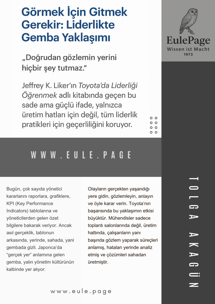 Jeffrey K. Liker’ın Toyota’da Liderliği Öğrenmek adlı kitabında geçen bu sade ama güçlü ifade, yalnızca üretim hatları için değil, tüm liderlik pratikleri için geçerliliğini koruyor.